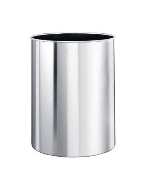 Runder Abfallbehälter aus Chromstahl mit schmalem, ausgebördeltem, oberen Rand, für den Inneneinsatz, mit Fassungsvermögen von 7 oder 15 Liter.