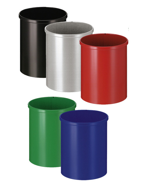 Runder Abfallbehälter aus Stahlblech, mit breitem, ausgebördeltem, oberen Rand, für den Inneneinsatz, mit Fassungsvermögen von 15 Liter.
