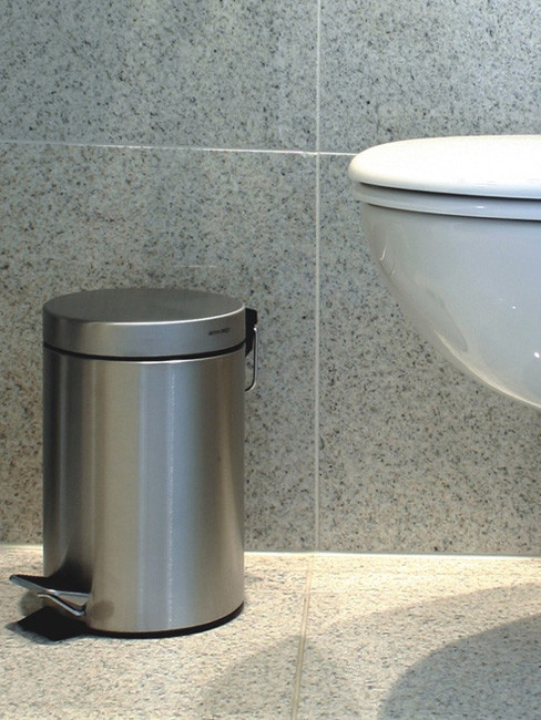 Pedal-Behälter mit Kunststoffeinsatz in Edelstahl geschliffen oder poliert sowie aus weiss oder schwarz beschichtetem Stahlblech sind mit Volumen von 3, 5, 12 und 30 Liter erhältlich.