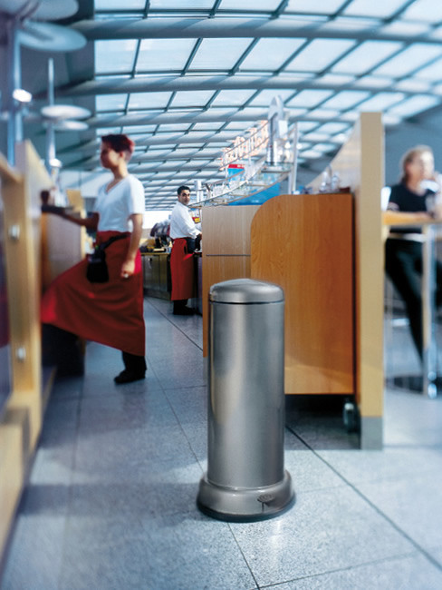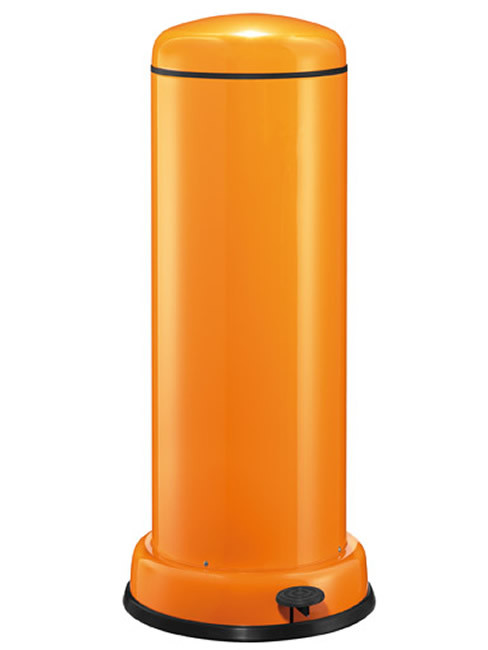 Robuster Pedal-Behälter mit einem Volumen von 30 Litern, gefertigt aus pulverbeschichtetem Stahlblech in den Farben weiß, rot, silber, graphit, schwarz, gelbgrün, braun, beige und orange. Alle Treteimer sind mit einem Innenbehälter aus Metall ausgerüstet.